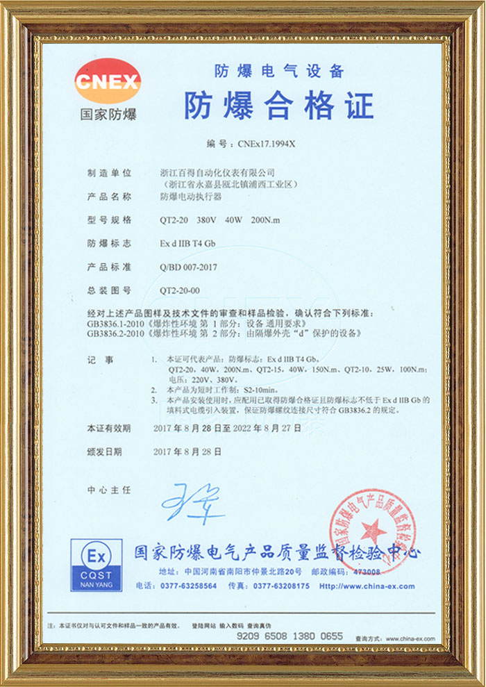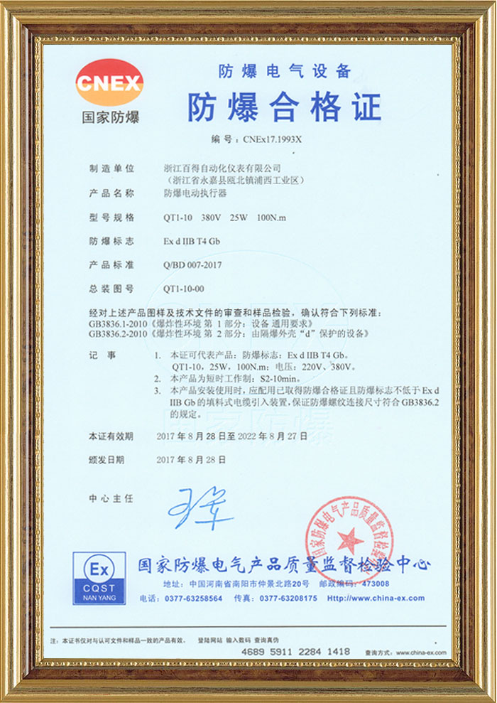電動球閥包含電動執行裝置驅動的多類型球閥產品,包括了各種形式密封面的多種規格的球閥產品。浙江百得自動化生產的電動球閥具備國家防爆合格證書,防爆性能更可靠。ISO9001認證產品,質量有保障!